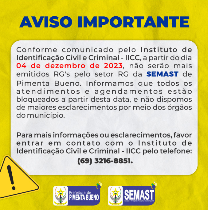 Conforme comunicado pelo Instituto de Identificação Civil e Criminal – IICC, a partir do dia 04 de dezembro de 2023, não serão mais emitidos RG’s pelo setor RG da SEMAST de Pimenta Bueno.