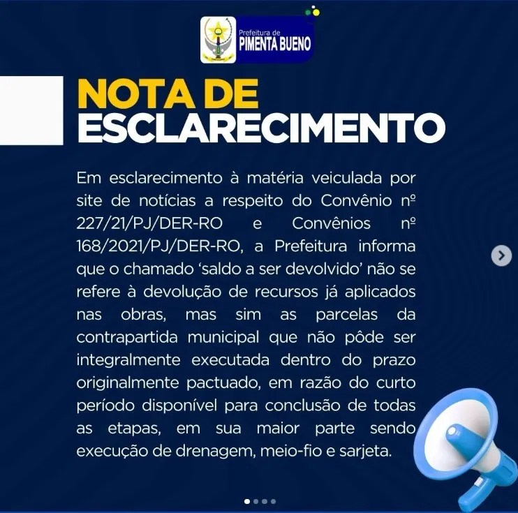 Em esclarecimento à matéria veiculada por site de notícias a respeito do Convênio nº 227/21/PJ/DER-RO e Convênios nº 168/2021/PJ/DER-RO, a Prefeitura informa que o chamado ‘saldo a ser devolvido’ não se refere à devolução de recursos já aplicados nas obras, mas sim as parcelas da contrapartida municipal que não pôde ser integralmente executada dentro do prazo originalmente pactuado, em razão do curto período disponível para conclusão de todas as etapas, em sua maior parte sendo execução de drenagem, meio-fio e sarjeta.