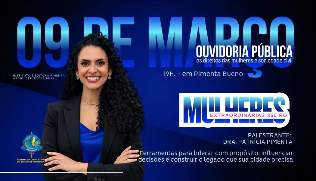 A Câmara Municipal de Pimenta Bueno convida toda a sociedade pimentense para participar do evento “Mulheres Extraordinárias”, que será realizado no dia 09 de março de 2026 (segunda-feira), às 19h, no Auditório da Câmara Municipal de Pimenta Bueno. A iniciativa é promovida pelo Instituto de Leis, em parceria com a Editora Pimenta, com apoio institucional da Assembleia Legislativa do Estado de Rondônia, e conta com o apoio desta Casa Legislativa.