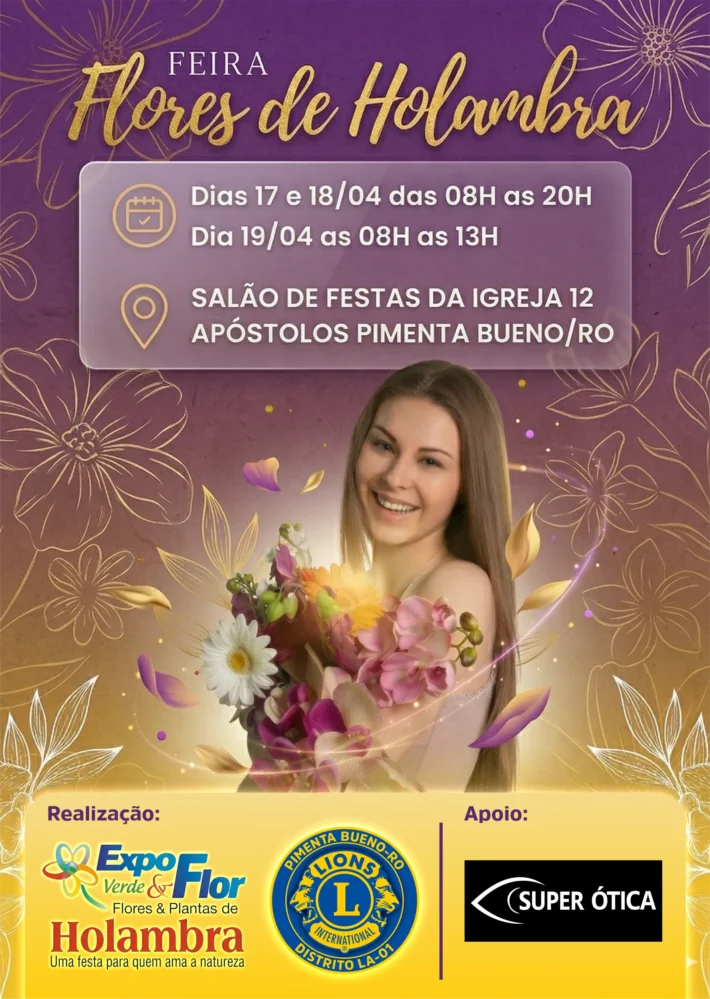 A população de Pimenta Bueno terá a oportunidade de voltar a vivenciar um verdadeiro espetáculo de cores, aromas e beleza natural com a realização da Feira Flores de Holambra, evento é promovido pelo Lions Clube de Pimenta Bueno, em parceria com a Expo Verde & Flor, uma tradicional iniciativa que traz ao público flores e plantas diretamente de Holambra, reconhecida nacionalmente como o maior polo de produção florícola do Brasil.