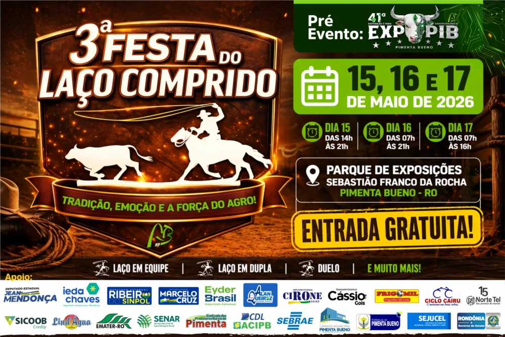 A tradição do Laço, a força do agro e o espírito de competição vão tomar conta de Pimenta Bueno com a realização da 3ª Festa do Laço Comprido da Associação Rural de Pimenta Bueno (ARPB), um dos principais pré-eventos que antecedem a aguardada 41ª EXPOPIB. O evento acontecerá entre os dias 15 e 17 de maio de 2026, no Parque de Exposições Sebastião Franco da Rocha, com entrada totalmente gratuita ao público.